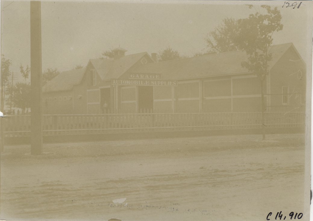 View of wooden-frame garage during the 1904 Vanderbilt Cup races on Long Island, New York. Sign displayed in front of garage reads: "Garage, automobile supplies." Handwritten on back: "Races and racing--Vanderbilt Cup races, 1904."
