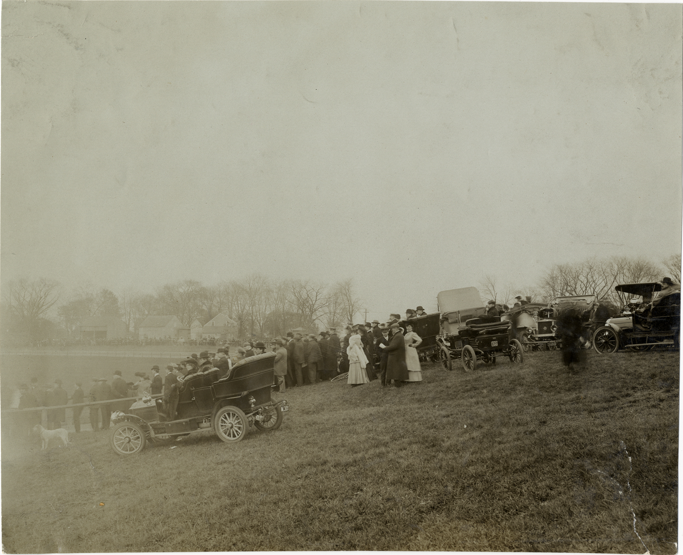 View of spectators and cars on side of track during the 1906 Waverly races at Weequahic Park in Waverly, New Jersey. Stamped on back: "Photo by F. Ed. Spooner, 1536 B'way, telephone 6536-38th St., New York, N.Y." Handwritten on back: "Weequahic Park, Waverly, N.J. Races and racing--Waverly races, 1906."