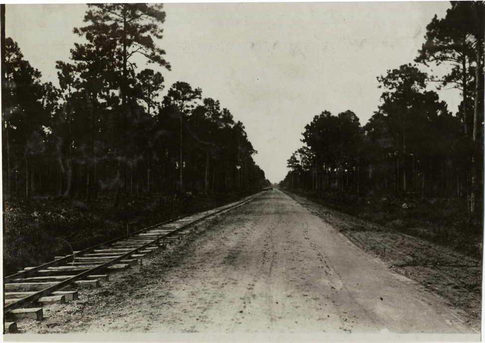 View of rural dirt road and railroad tracks. Handwritten on back: "Roads, 1908."
