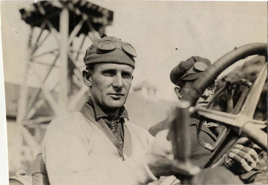 Al Denison and passenger in racecar, 1908 Vanderbilt Cup races