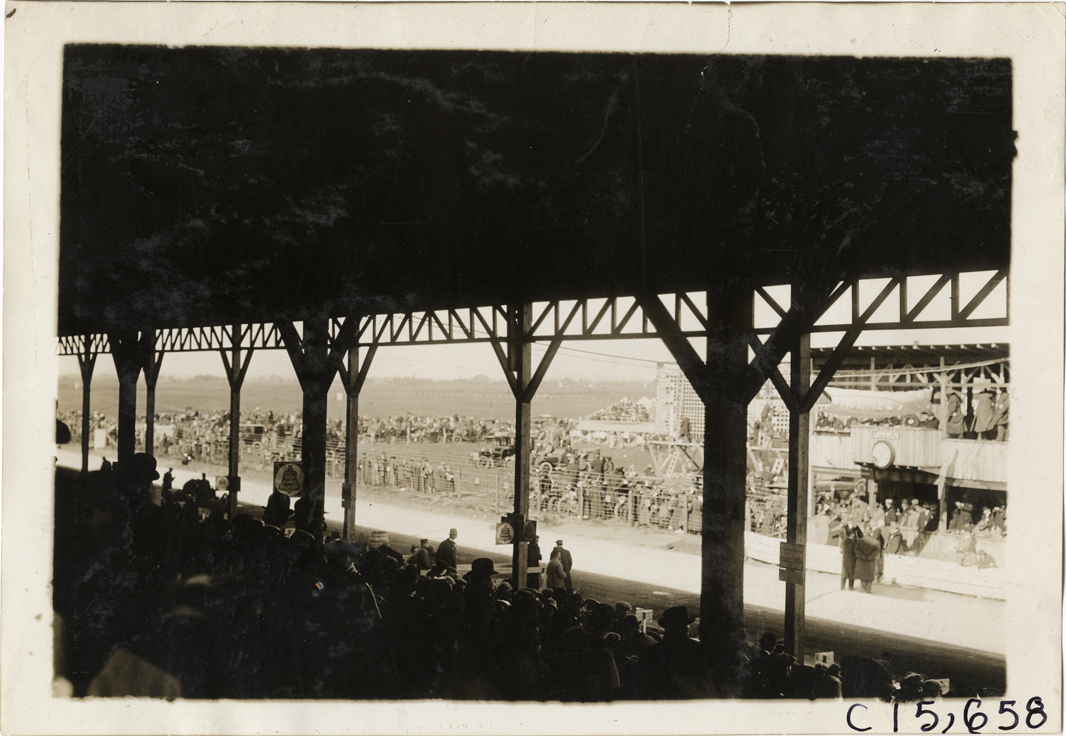 View of spectators in grandstand and on roadside during the 1909 Vanderbilt Cup races on Long Island, New York. Stamped on back: "Photo by Spooner & Wells, Inc. 1931 Broadway, N.Y." Handwritten on back: "Races and racing--Vanderbilt Cup races, 1909."