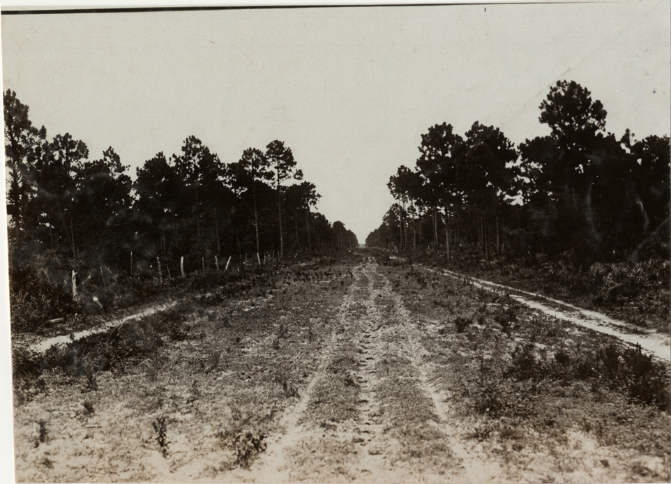View of tree-lined rural dirt road, overgrown with grass and weeds. Handwritten on back: "Roads, 1908."