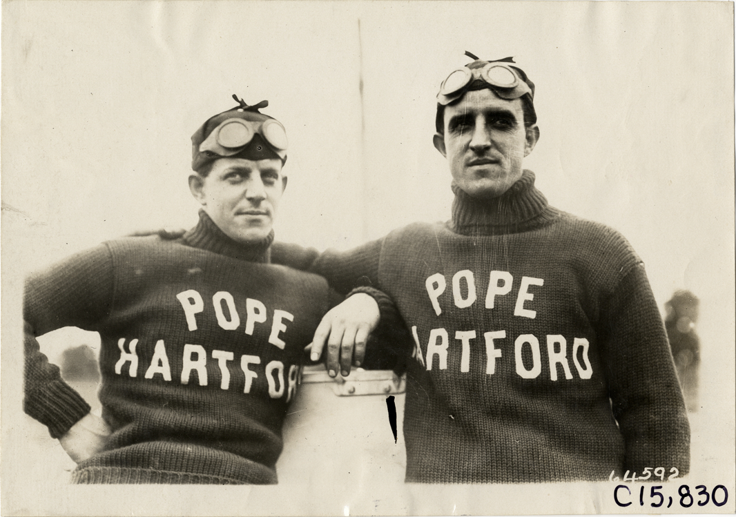 Close-up view of drivers Bert Dingley and Joe Matson, wearing Pope-Hartford sweaters, during the 1910 Vanderbilt Cup races on Long Island, New York. Stamped on back: "Spooner & Wells, Inc., photographers, telephones 3472-3473 Columbus, 1931 Broadway, New York." Handwritten on back: "Races and racing--Vanderbilt Cup races, 1910."