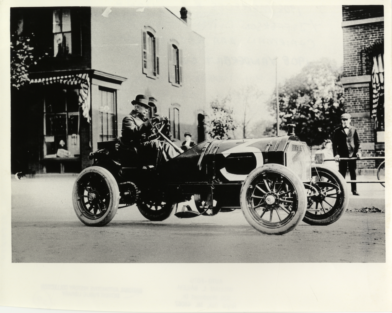 View of chairman Jefferson De Mont Thompson driving Mercedes car no. 3 during the 1908 Vanderbilt Cup races on Long Island, New York. Handwritten on back: "1908 Mercedes #3, 120 h.p. w/ Jefferson De Mont Thompson, chairman AAA Racing Board. Owned by Robert Graves & driven by Stricker. He finished 6th in the race, retiring after the 9th lap. Races and racing--Vanderbilt Cup races, 1908."