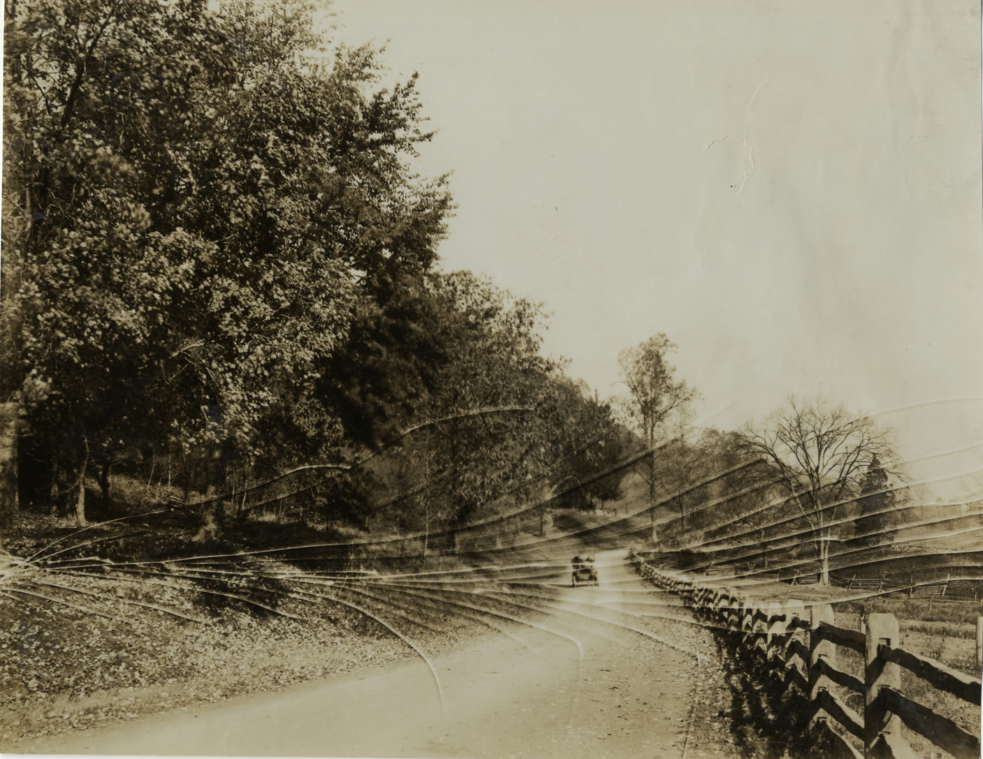 View of car traveling on rural dirt road. Fence on right. Handwritten on back: "Roads."