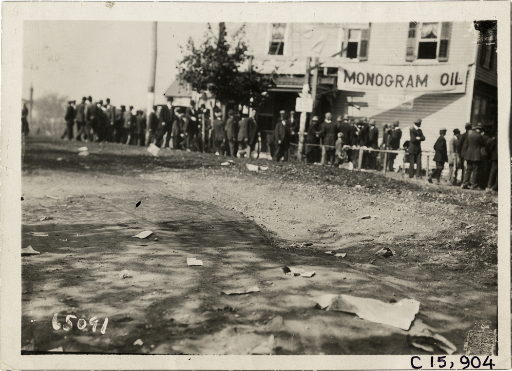 View of spectators on roadside during the 1910 Vanderbilt Cup races on Long Island, New York. Wooden-frame building and Monogram oil banner in background. Stamped on back: "Spooner & Wells, Inc., photographers, telephones 3472-3473 Columbus, 1931 Broadway, New York." Handwritten on back: "Races and racing--Vanderbilt Cup races, 1910."