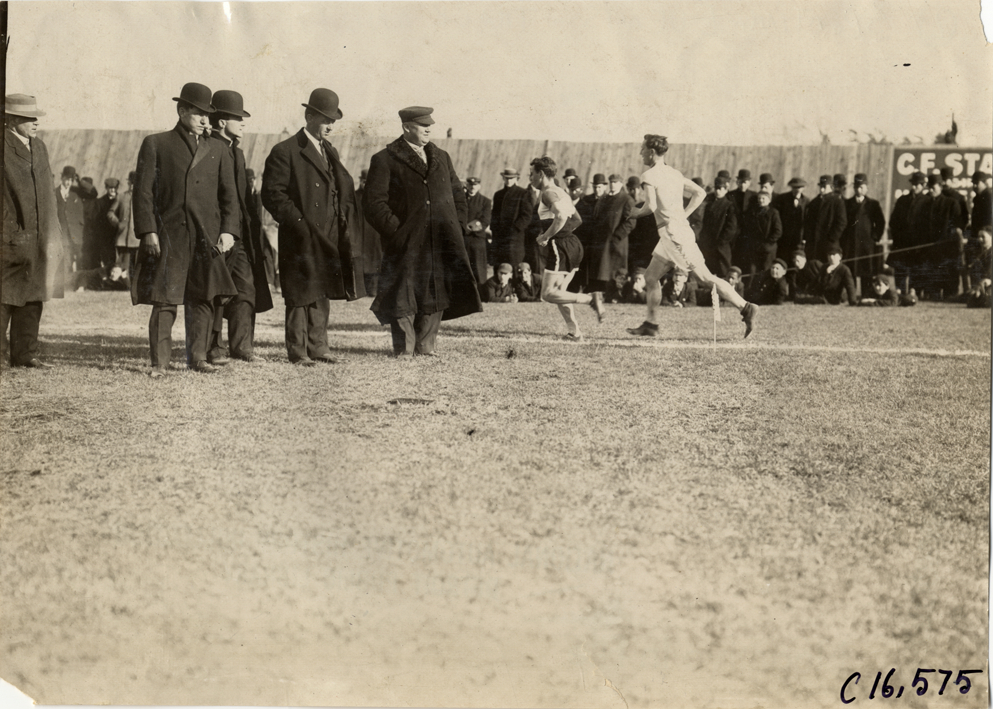 View of runners Jimmy Maloney and Henri St. Ives competing in marathon race. Officials in foreground; spectators in background. Stamped on back: "Spooner & Wells, Inc., photographers, telephones 3472-3473 Columbus, 1931 Broadway, New York." Handwritten on back: "Maloney trailing St. Ives. Sporting events--Track and field, 1909."