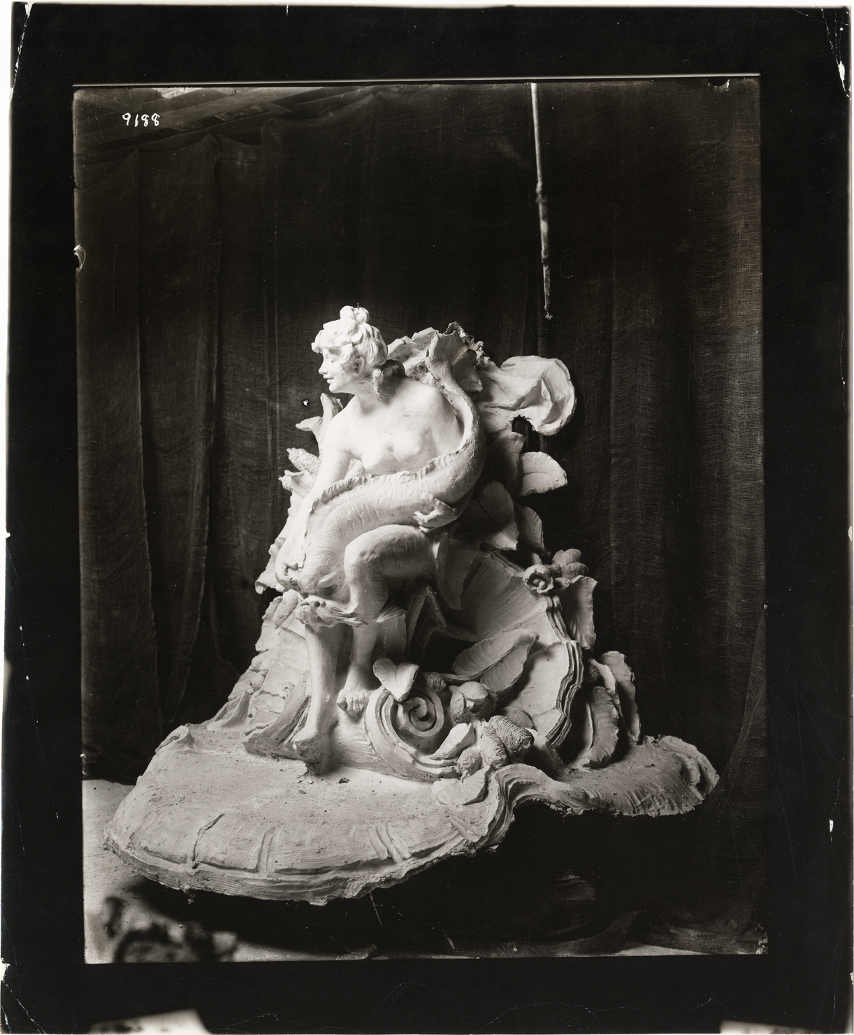 View of sculpture on exhibit during the 1907 New York Auto Show held at Madison Square Garden. Sculpture depicts woman sitting on seashell and holding a fish. Stamped on back: "Photographic illustration by Nick Lazarnick, 230 Park Ave., N.Y." Handwritten on back: "1907, MSG, a decoration of the auto show. Shows--New York, 1907."