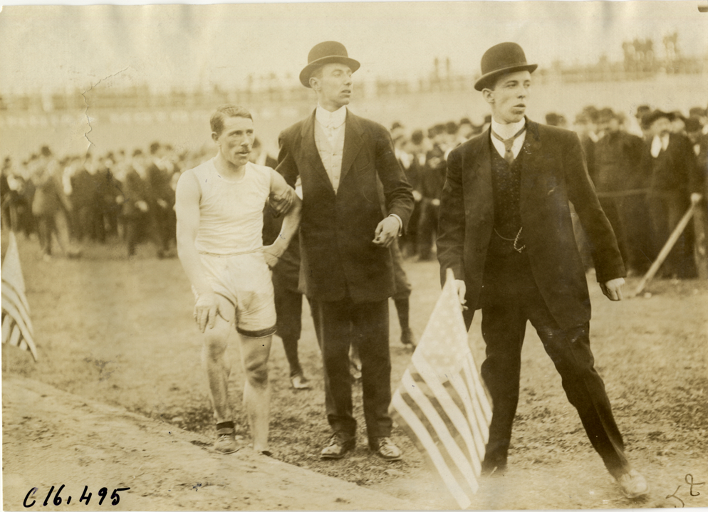 View of runner with two officials on side of track during meet. Spectators in background. Handwritten on back: "Sporting events--Track and field, 1909."