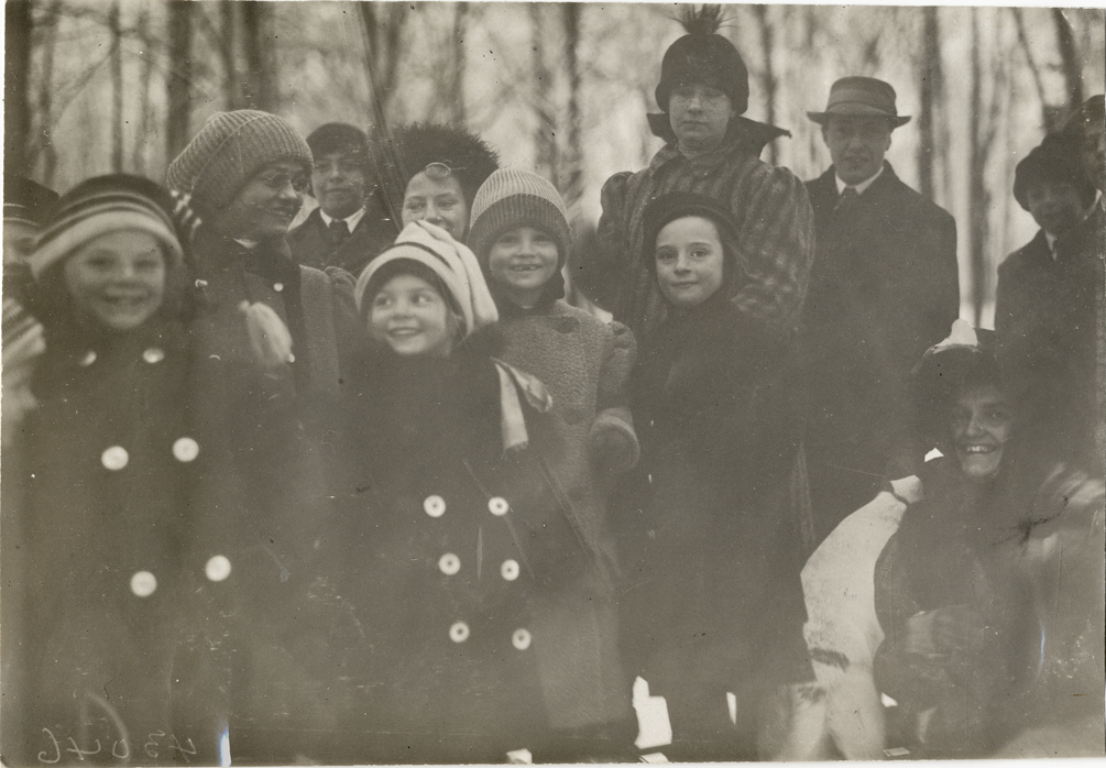 View of men, women and children at 1909 bobsledding competition held in Huntington, Long Island. Handwritten on back: "Sporting events--Bobsled races (Huntington, Long Island), 1909."