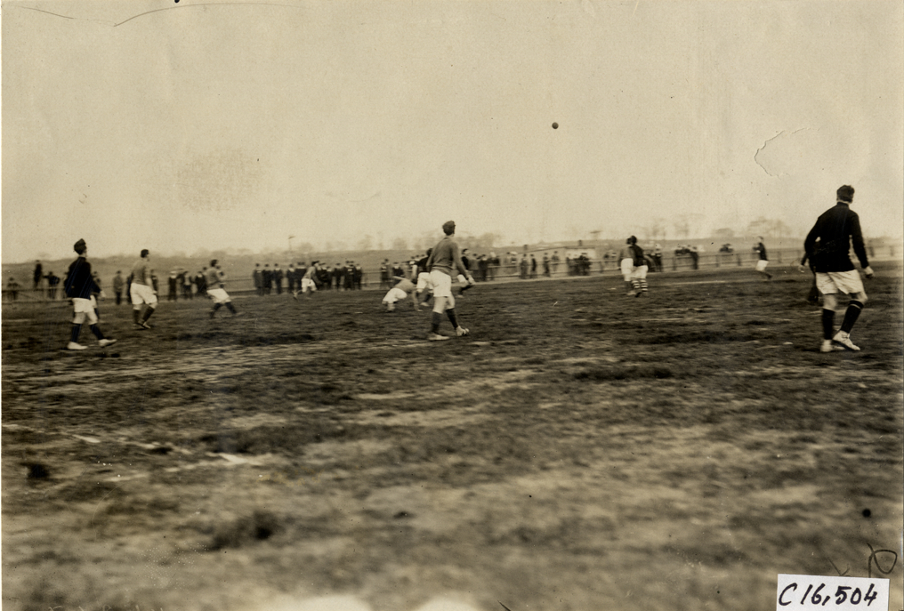 View of soccer game with ball in midair. Stamped on back: "Spooner & Wells, Inc., photographers, telephones 3472-3473 Columbus, 1931 Broadway, New York." Handwritten on back: "Sporting events--Track and field, 1909."