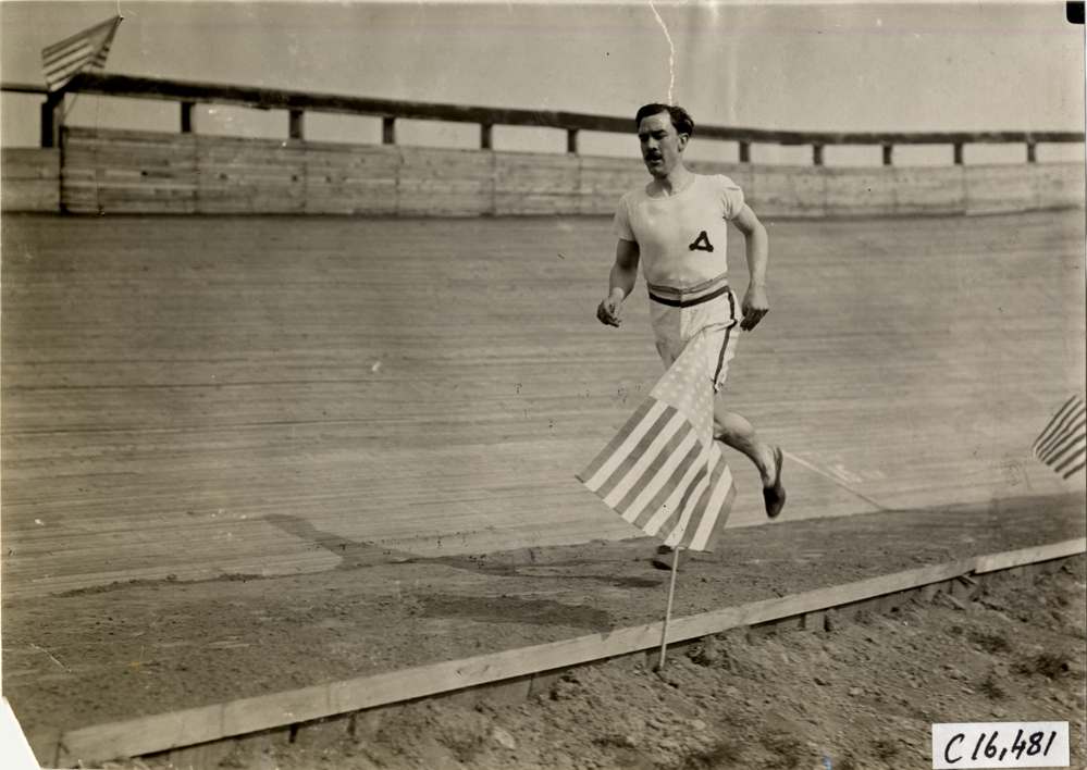 View of runner racing on inside of banked track. American flags line track. Stamped on back: "Spooner & Wells, Inc., photographers, telephones 3472-3473 Columbus, 1931 Broadway, New York." Handwritten on back: "Sporting events--Track and field, 1909."