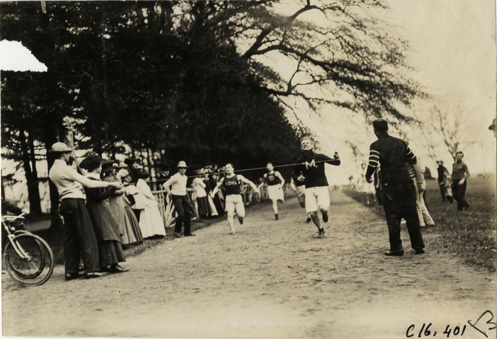 View of runners approaching finish line during race at track meet. Spectators and officials watch from sidelines. Handwritten on back: "Sporting events--Track and field, 1909."