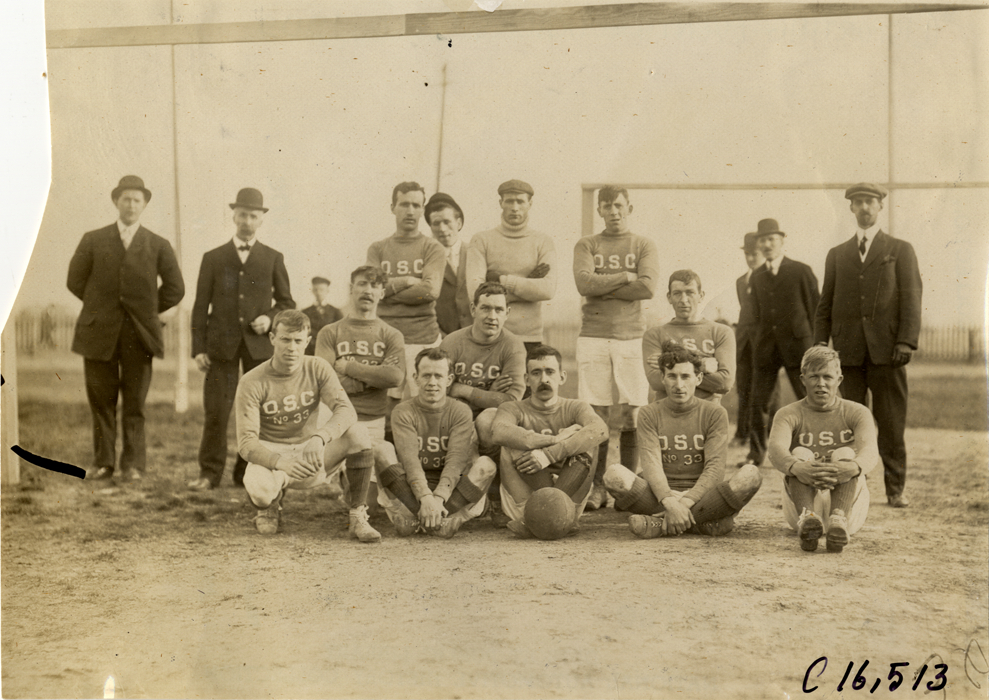 Group portrait of soccer players, coaches and officials. Stamped on back: "Spooner & Wells, Inc., photographers, telephones 3472-3473 Columbus, 1931 Broadway, New York." Handwritten on back: "Sporting events--Track and field, 1909."