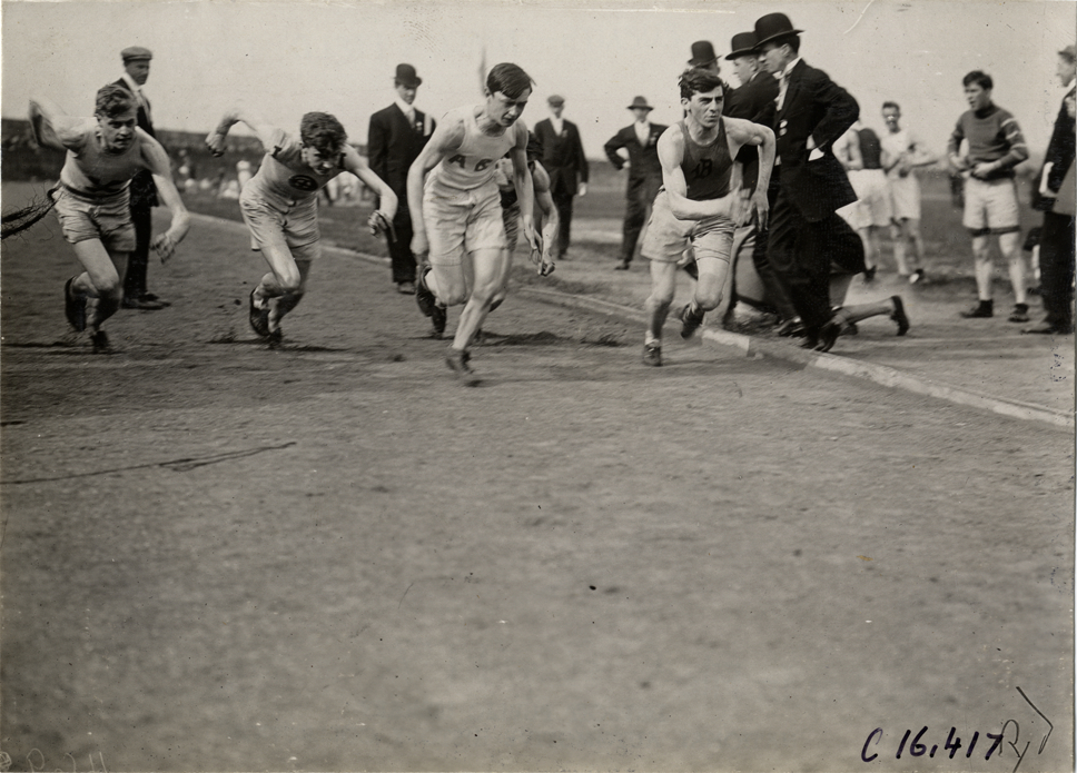 View of runners at start of race at track meet. Officials and spectators in background. Handwritten on back: "Sporting events--Track and field, 1909."