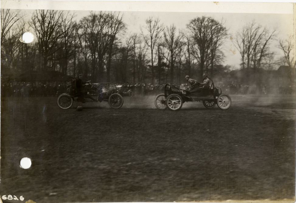 View of two cars participating in auto polo game at Clark Park in Detroit, Michigan. Spectators in background. Handwritten on back: "Autopolo game at Clark's Park, 1912. Sporting events--Autopolo, 1912."