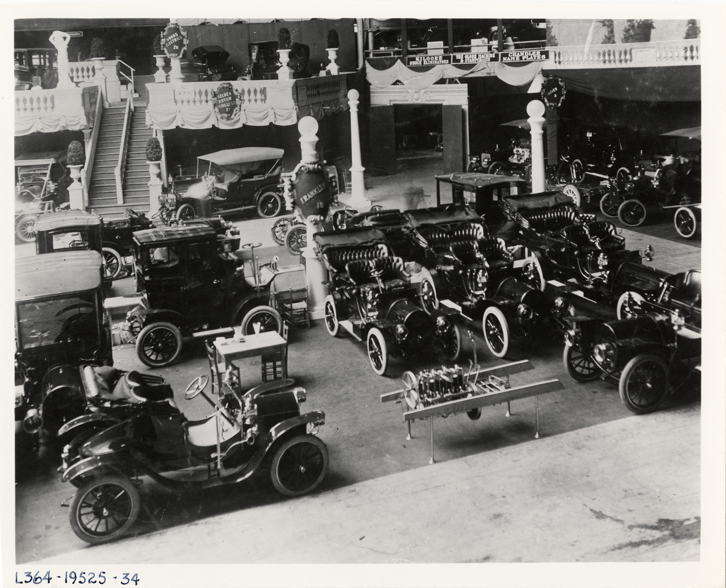 View of Franklin cars on exhibit during the 1908 New York Auto Show held at Madison Square Garden. Handwritten on back: "Shows--New York, 1908."