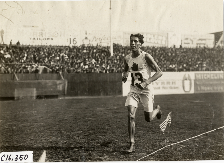 View of runner competing in race at track meet. Spectators in grandstand. Stamped on back: "Spooner & Wells, Inc., photographers, telephones 3472-3473 Columbus, 1931 Broadway, New York." Handwritten on back: "Sporting events--Track and field, 1909."