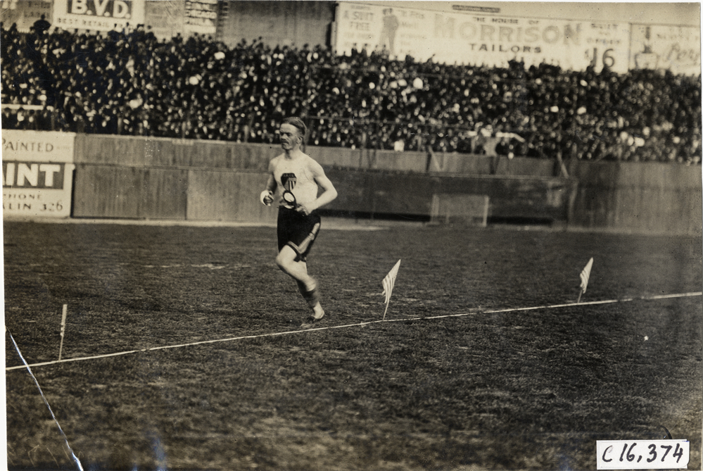 View of runner competing in race at track meet. Spectators in grandstand. Stamped on back: "Spooner & Wells, Inc., photographers, telephones 3472-3473 Columbus, 1931 Broadway, New York." Handwritten on back: "Sporting events--Track and field, 1909."
