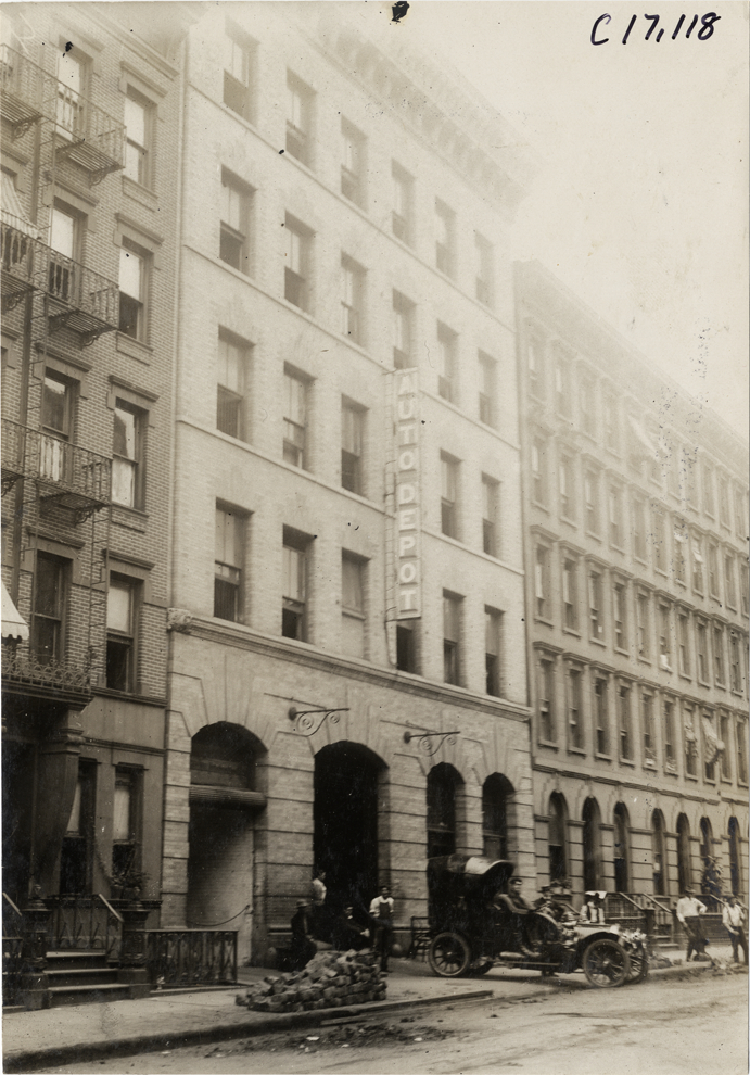 View of driver in car parked in front of the Auto Depot garage. Multistory Italianate building displays "Auto Depot" sign. Men work on street in background; piles of bricks on sidewalk. Stamped on back: "F. Ed. Spooner, and Chas. S. Wells. Motor News, Motor Photos, Motor Adv, 1536 B'way, New York. Tel 6536-38th St." Handwritten on back: "Streets, 1906."
