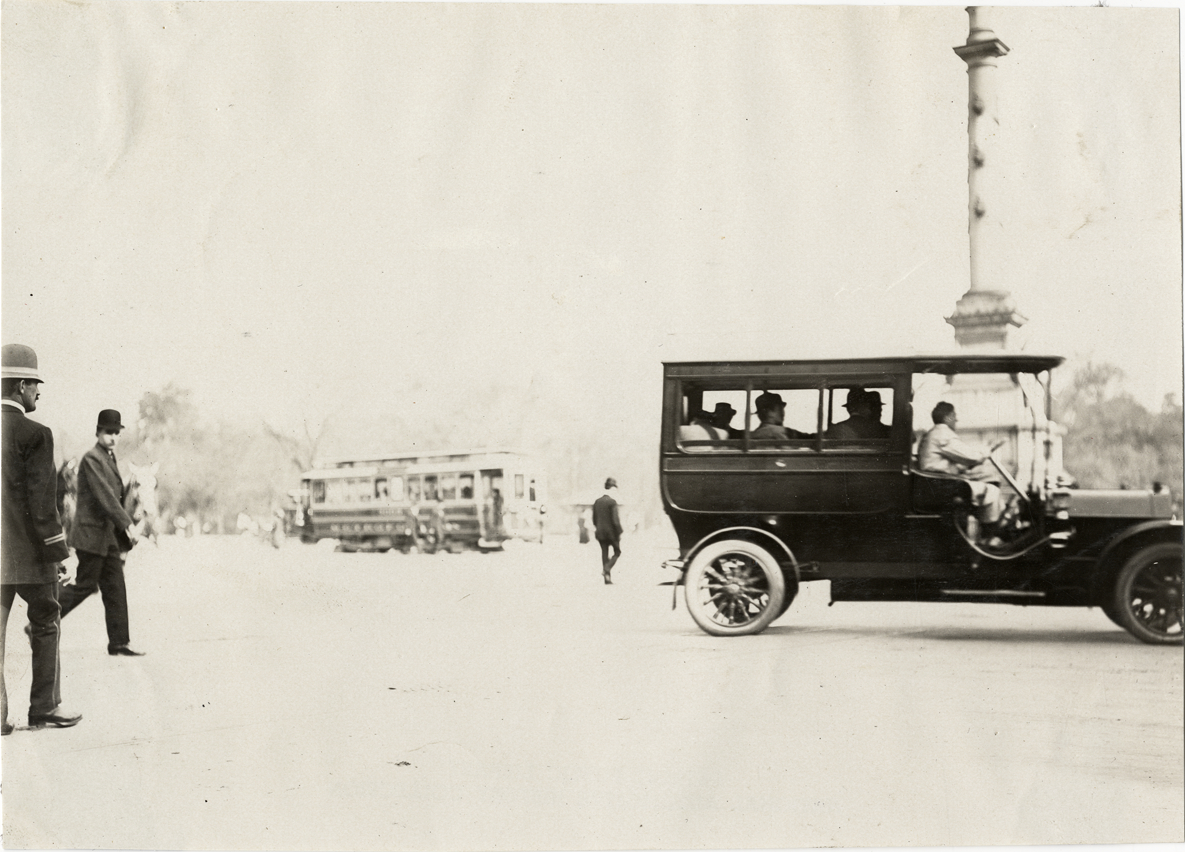 View of motorists in car and streetcar at Columbus Circle, New York City. Policeman in foreground. Handwritten on back: "N.Y. Streets, 1908."