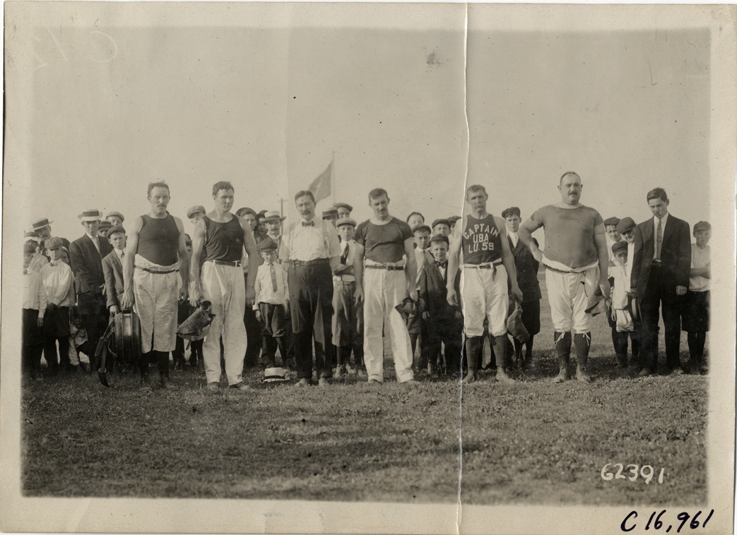 View of five athletes, probably tug of war competitors, posing with spectators at the 1910 Flatbush Marathon race. Man on right wears jersey emblazoned with "Captain, U.B.A., L.U. 59." Stamped on back: "Spooner & Wells, Inc., photographers, telephones 3472-3473 Columbus, 1931 Broadway, New York." Handwritten on back: "The Flatbush Marathon. Sporting events--Track and field, 1910."