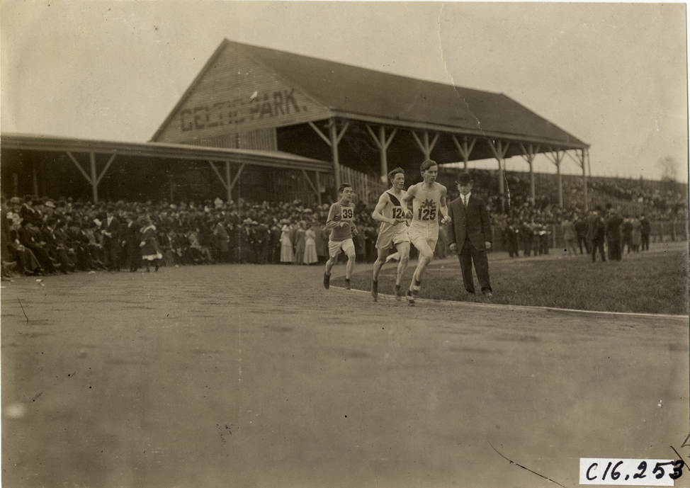 View of runners competing in the 1909 New Jersey Marathon. Spectators and grandstand in background; "Celtic Park" painted on structure. Stamped on back: "Spooner & Wells, Inc., photographers, telephones 3472-3473 Columbus, 1931 Broadway, New York." Handwritten on back: "Sporting events--Track and field (New Jersey Marathon), 1909."
