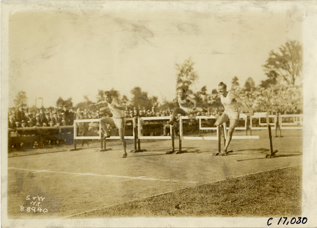 View of track and field athletes clearing hurdles during competition. Printed on front: "S & W, N.Y." Handwritten on back: "Sporting events--Track and field, 1915."