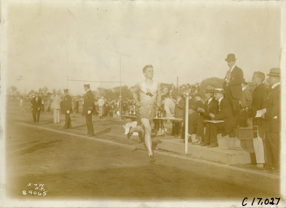 View of runner competing in race. Spectators, policemen and officials watch from sidelines. Printed on front: "S & W, N.Y." Handwritten on back: "Sporting events--Track and field, 1915."