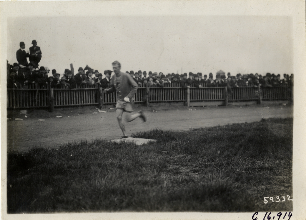 View of runner competing in marathon race. Spectators behind fence in background. Stamped on back: "Spooner & Wells, Inc., photographers, telephones 3472-3473 Columbus, 1931 Broadway, New York." Handwritten on back: "Sporting events--Track and field, 1910."