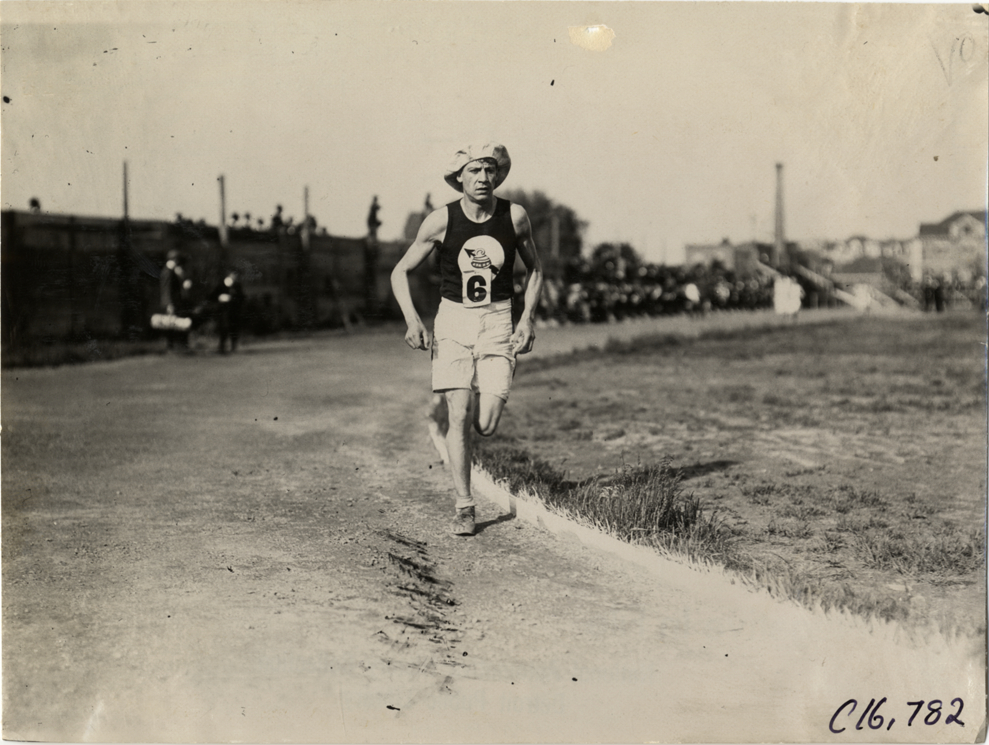 View of George Obermeyer running in race at track meet. Handwritten on back: "Geo. Obermeyer. Sporting events--Track and field, 1909."