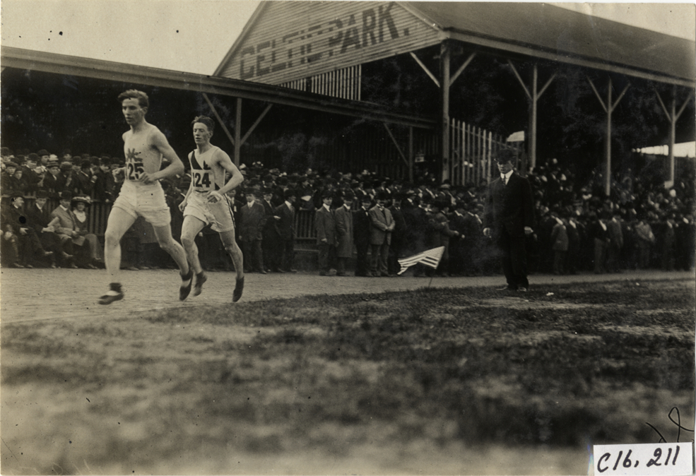 View of runners Mueller and Lee competing in the 1909 New Jersey Marathon. Spectators in grandstand in background; "Celtic Park" painted on structure. Stamped on back: "Spooner and Wells, 1931 Broadway, New York, duplicates any time, enlargements all sizes, tel. 3472-3473 Col., credit appreciated." Handwritten on back: "Mueller, Lee. Sporting events--Track and field (New Jersey Marathon), 1909."