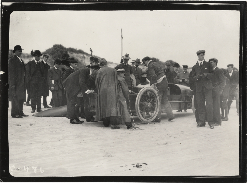 View of driver Fred Marriot and onlookers surrounding "Rocket" Stanley Steamer car on Ormond Beach during the 1906 Ormond-Daytona races in Florida. Stamped on back: "Photographic illustration by Nick Lazarnick, 230 Park Ave., N.Y." Typed on back: "Fred Marriott [sic], Stanley 'Rocket', Ormond-Daytona, 1906." Handwritten on back: "Fred Marriot in Stanley Steamer, Ormond. Stanley Steamer, 1906."