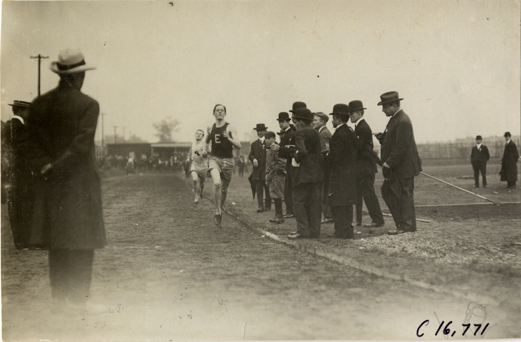 View of Rosenberger followed by another runner in race at track meet. Officials watch from sidelines. Handwritten on back: "Sporting events--Track and field, 1909."