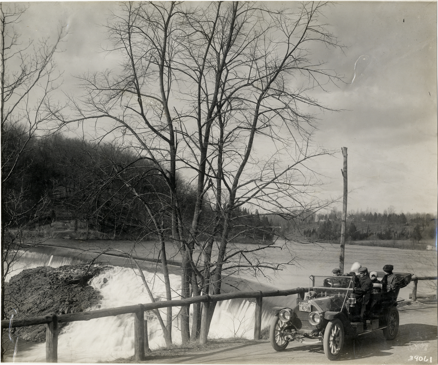 Motorists in 1911 Thomas automobile, stopping to look at waterfall