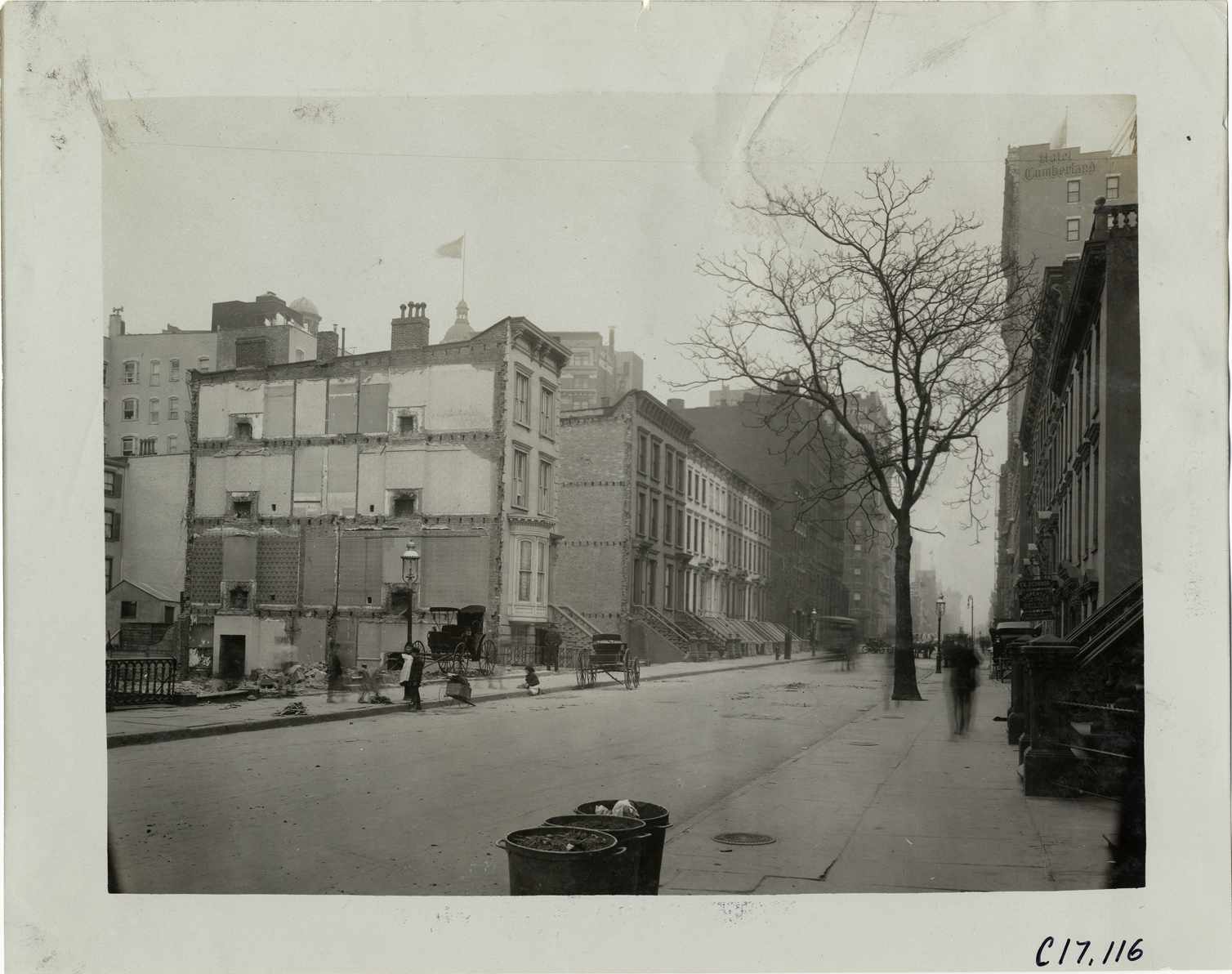 View of rowhouses on street. Row house in foreground has exposed interior wall; children play on sidewalk. Trash cans in foreground. Handwritten on back: "Streets, 1905."