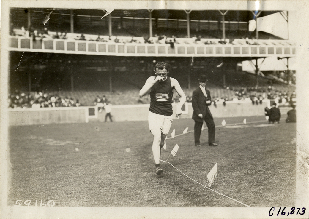 View of runner Ted Crook competing in marathon race. Officials and grandstand in background. Stamped on back: "Spooner & Wells, Inc., photographers, telephones 3472-3473 Columbus, 1931 Broadway, New York." Handwritten on back: "Ted Crook. Sporting events--Track and field, 1910."