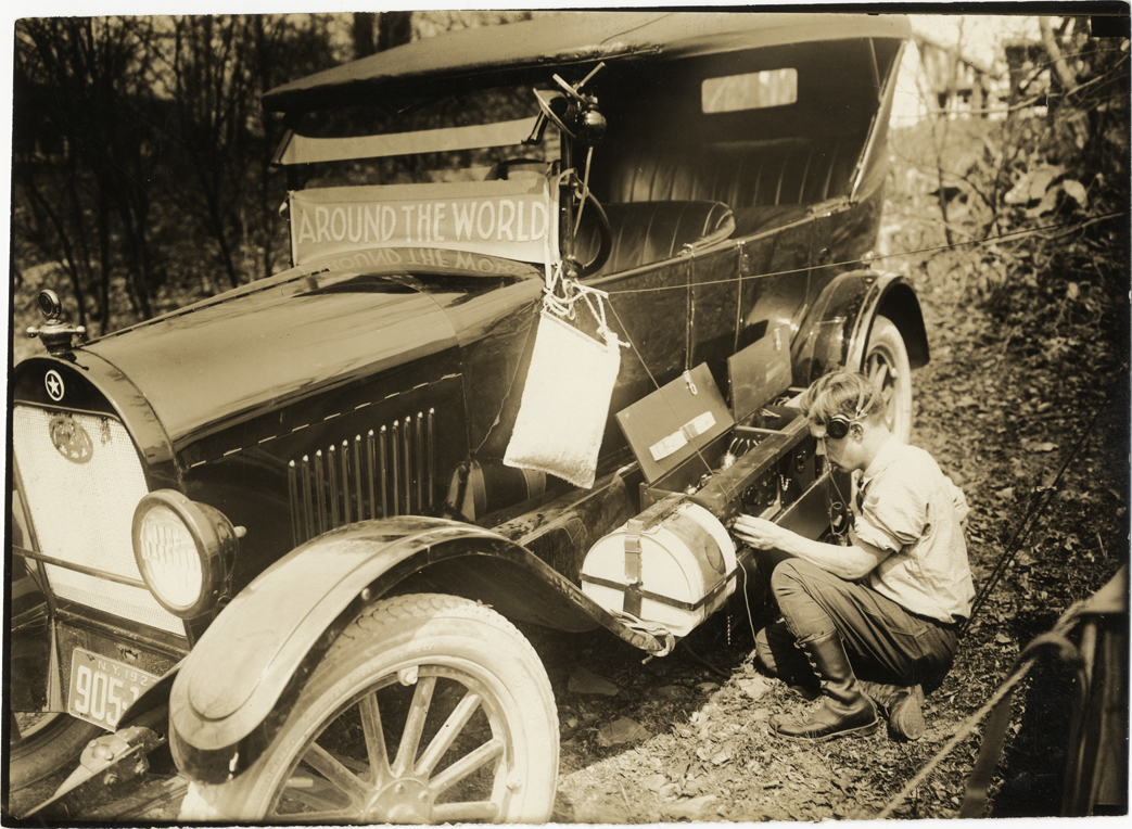 View of man operating radio on running board of Star car in rural area. "Around the world" banner is displayed on windshield. Handwritten on back: "Star (New Jersey), c.1923."