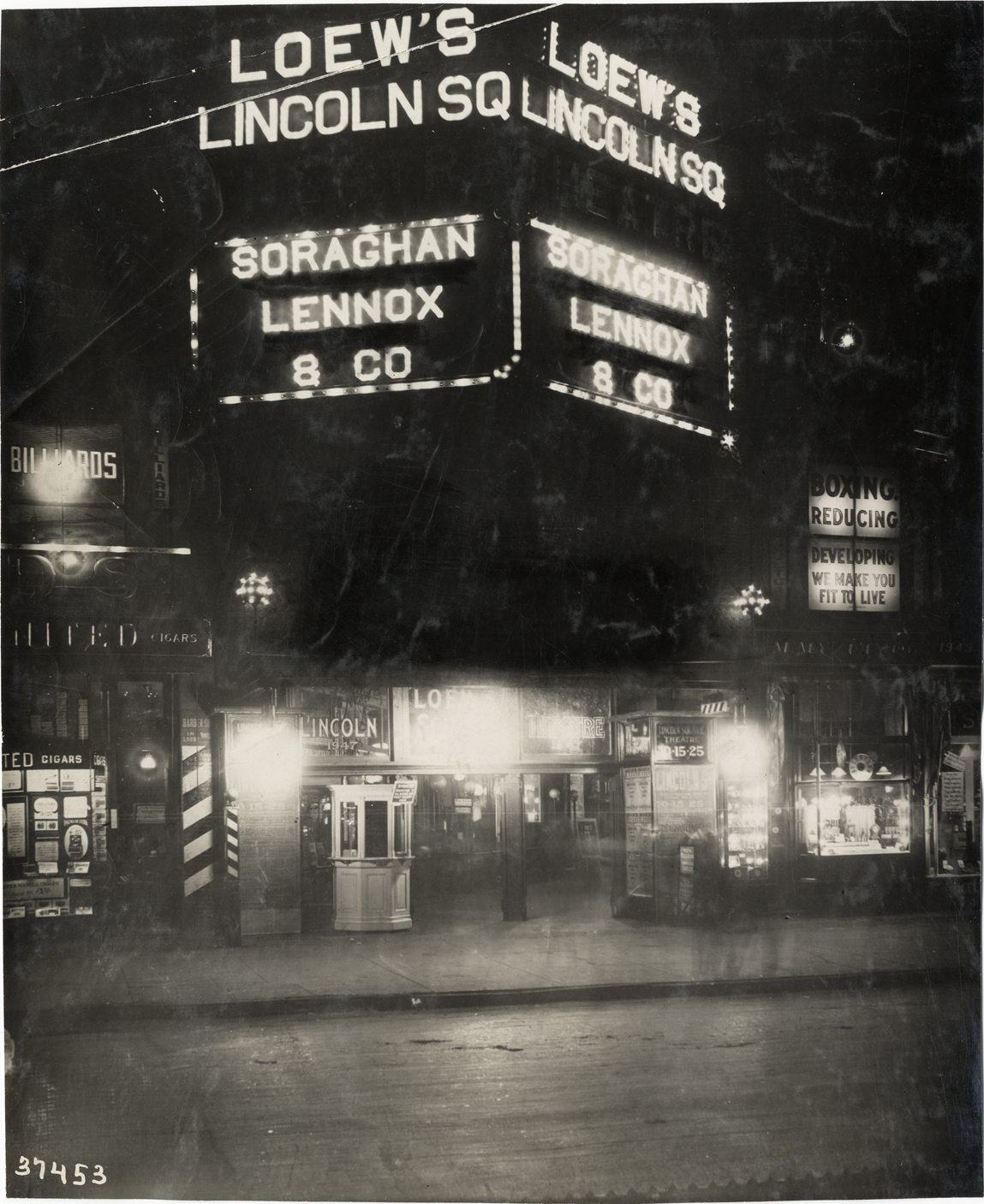 Nighttime view of Loew's Lincoln Square Theatre in New York. "Soraghan, Lennox & Co." in electric lights on marquee. Lighted storefronts on street. Stamped on back: "Spooner & Wells, Inc., photographers, telephones 3472-3473 Columbus, 1931 Broadway, New York." Handwritten on back: "Loew's Lincoln Square Theatre, New York City, 1910. Theaters."