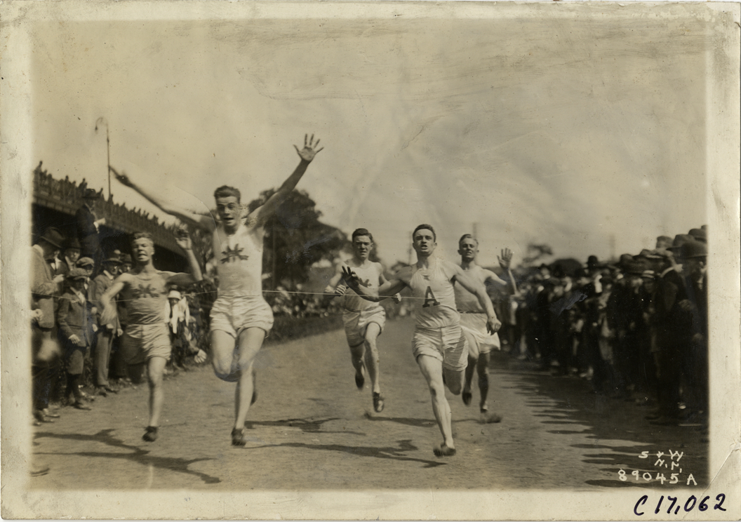 View of runners approaching finish line during race. Printed on front: "S & W, N.Y." Handwritten on back: "Sporting events--Track and field, 1915."