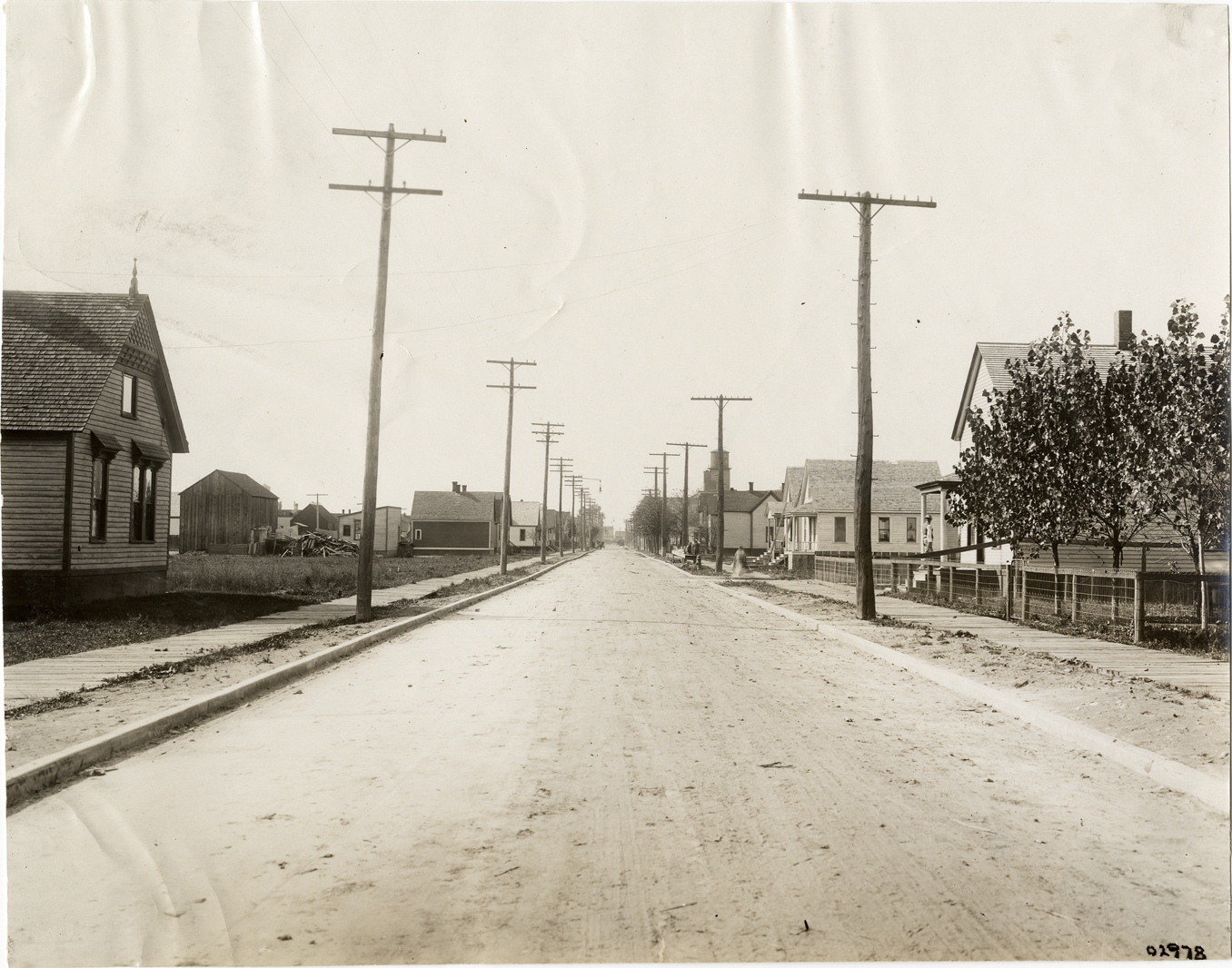 View of houses on street on the east side of Detroit. Handwritten on back: "East side, Detroit. Streets--Detroit, 1911."