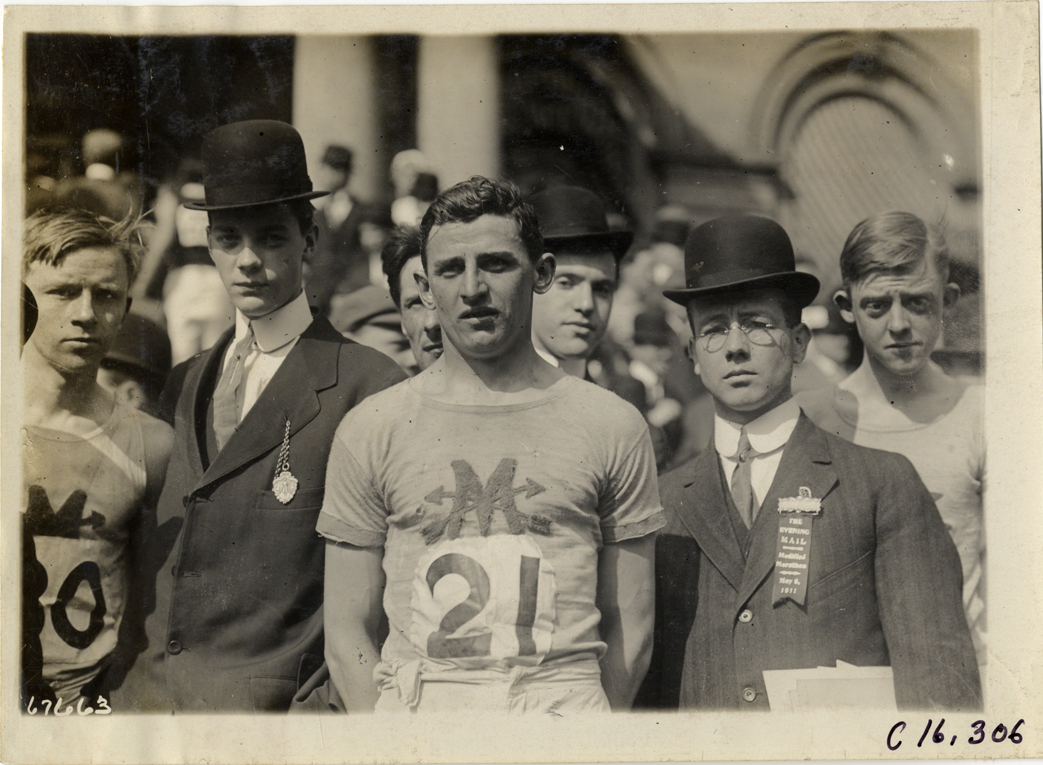 View of runner Frank Masterson posing with officials during the 1911 Evening Mail Modified Marathon. Athletes and spectators in background. Stamped on back: "Spooner & Wells, Inc., photographers, telephones 3472-3473 Columbus, 1931 Broadway, New York." Handwritten on back: "The Evening Mail Modified Marathon. Sporting events--Track and field, 1911."