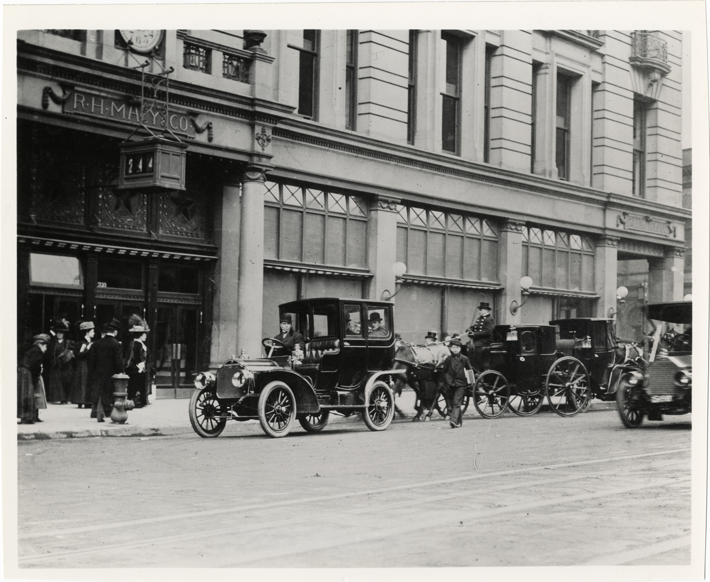View of car, horse-drawn carriage and pedestrians in front of R.H. Macy and Company store in New York. Handwritten on back: "Automobiles were showing signs of being prevalent in N.Y. around Christmas of 1907, as this scene in front of N.Y.'s R.H. Macy and Company store. Streets--New York."