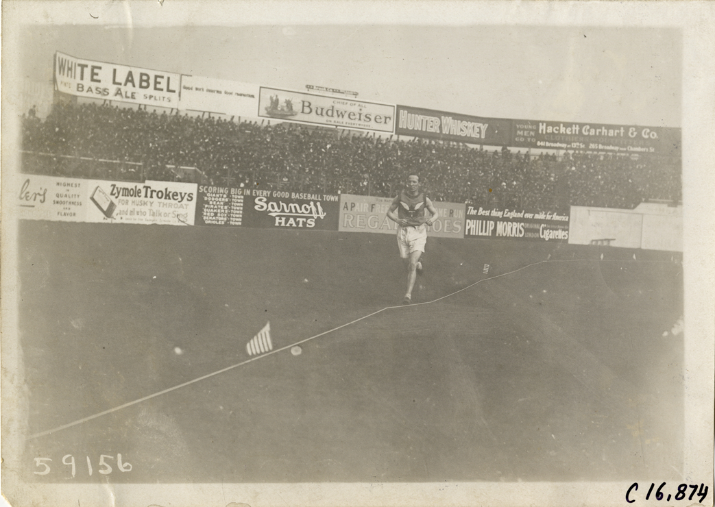 View of runner competing in marathon race. Spectators and advertising billboards in background. Stamped on back: "Spooner & Wells, Inc., photographers, telephones 3472-3473 Columbus, 1931 Broadway, New York." Handwritten on back: "Sporting events--Track and field, 1910."