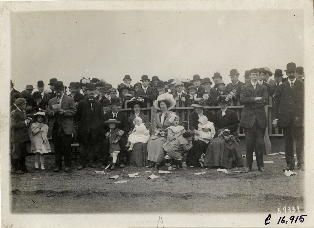 View of spectators at marathon race; women in front row hold young children in their laps. Stamped on back: "Spooner & Wells, Inc., photographers, telephones 3472-3473 Columbus, 1931 Broadway, New York." Handwritten on back: "Sporting events--Track and field, 1910."