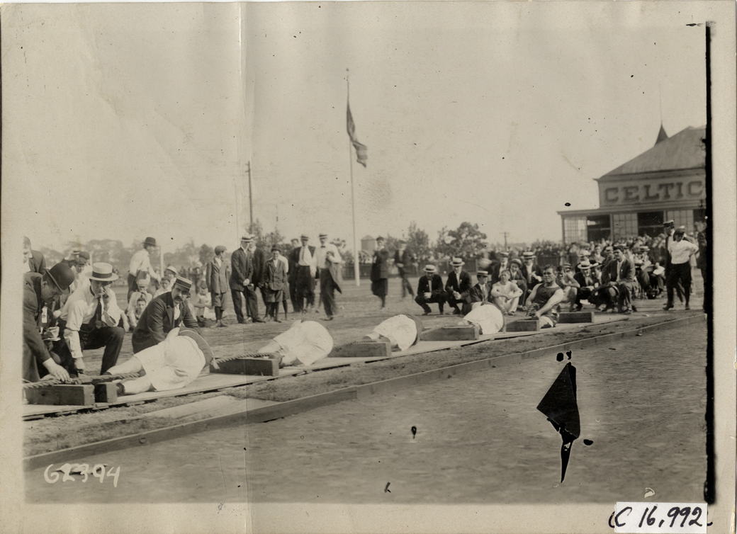 Men competing in tug of war contest, 1910 Flatbush Marathon