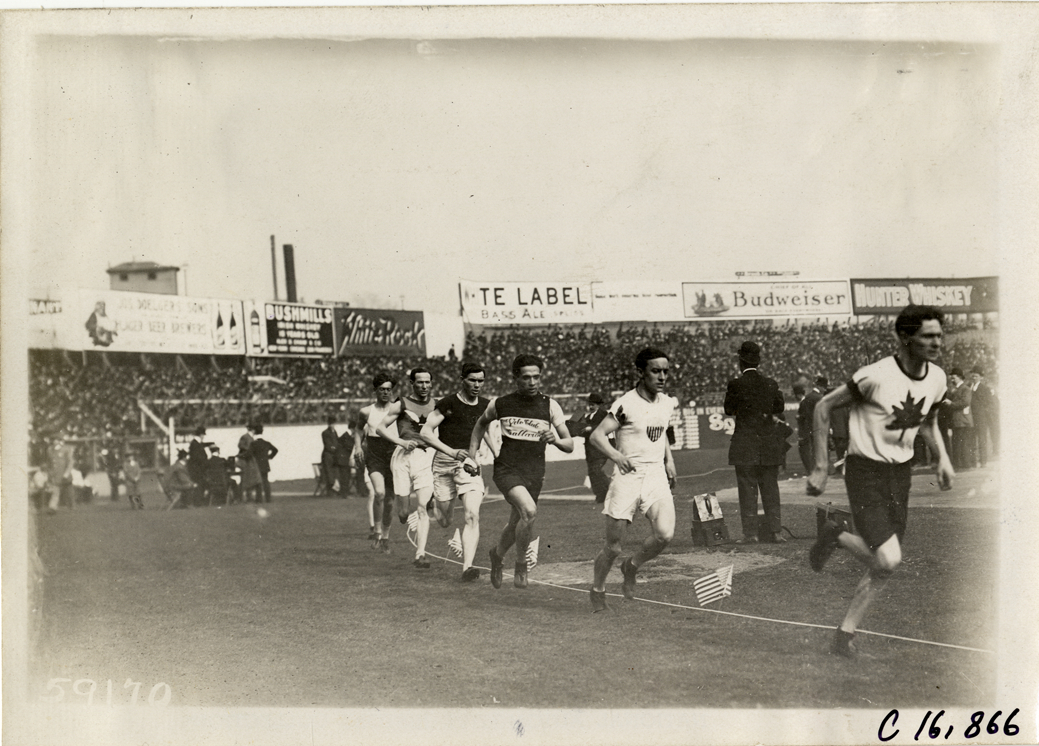 View of runners competing in marathon race. Officials watch from sidelines; grandstand in background. Stamped on back: "Spooner & Wells, Inc., photographers, telephones 3472-3473 Columbus, 1931 Broadway, New York." Handwritten on back: "Sporting events--Track and field, 1910."