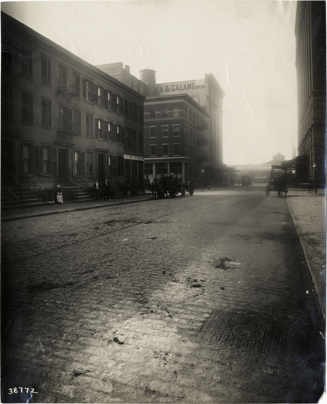 View of residential buildings and horse-drawn wagon along brick street in New York City. N.Y. Port Society Free Reading Room on corner. Stamped on back: "Spooner & Wells, Inc., photographers, telephones 3472-3473 Columbus, 1931 Broadway, New York." Handwritten on back: "Streets--New York, 1911."