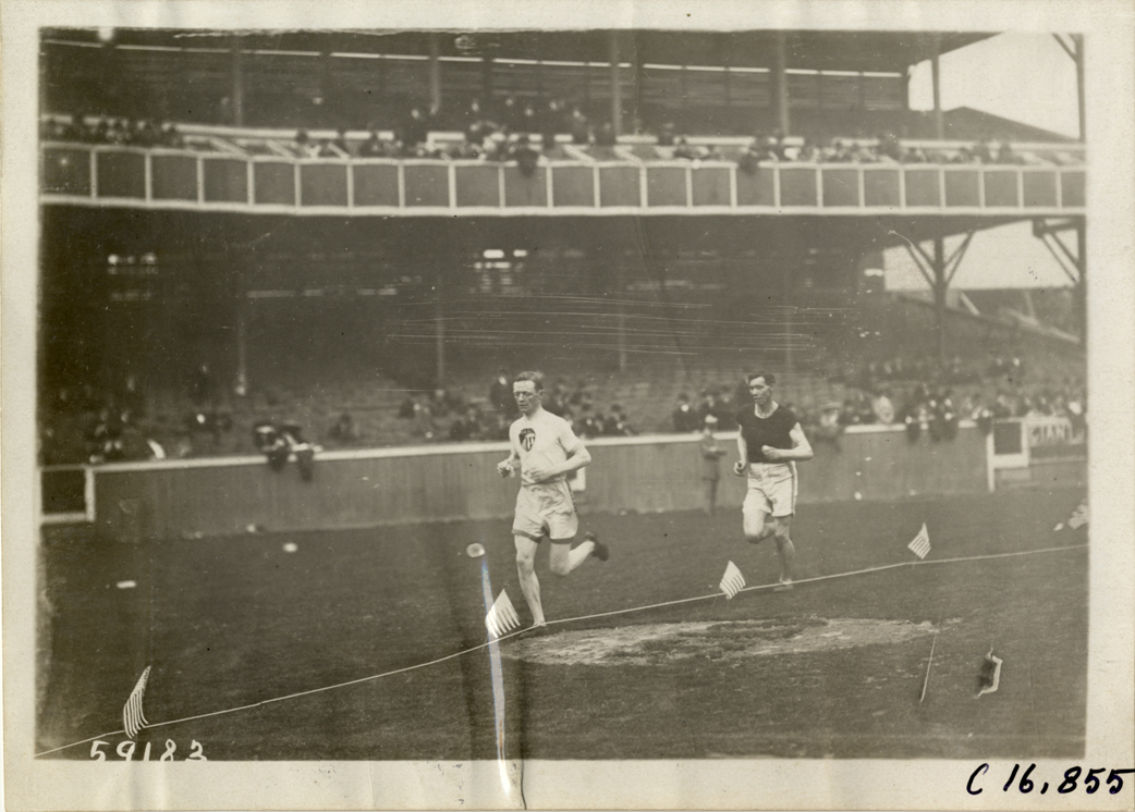 Distant view of Jim Crowley and unidentified runner competing in marathon race. Grandstand in background. Stamped on back: "Spooner & Wells, Inc., photographers, telephones 3472-3473 Columbus, 1931 Broadway, New York." Handwritten on back: "Sporting events--Track and field, 1910."