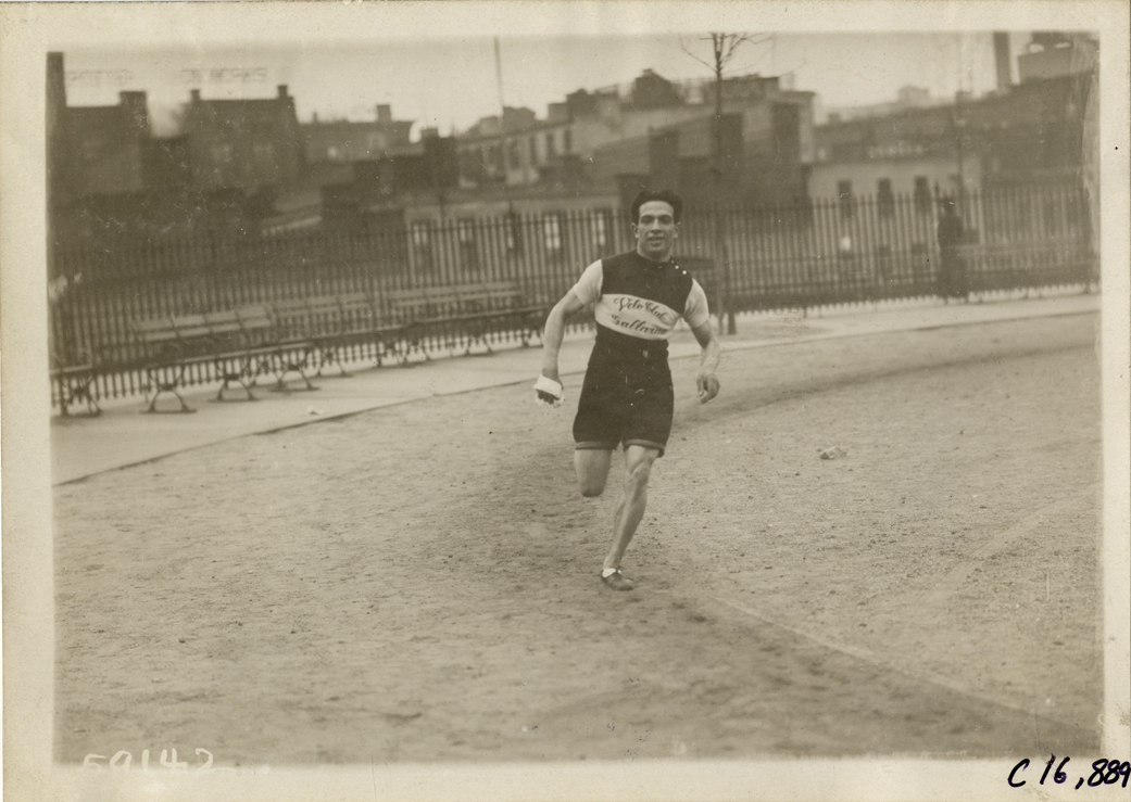 View of runner competing in marathon race. Runner wears jersey with "Velo Club, Gallarate" logo; fence in background. Stamped on back: "Spooner & Wells, Inc., photographers, telephones 3472-3473 Columbus, 1931 Broadway, New York." Handwritten on back: "Sporting events--Track and field, 1910."